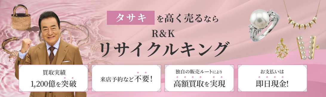 日本が世界に誇るジュエラー、タサキ(TASAKI)の買取ならリサイクルキングにお任せください。「バランス」や「デインジャー」、「アブストラクト スター」といったモダンで革新的なコレクションは特に高価買取が期待できます。長年ご愛用されたパールネックレスやリング、ピアスなど、変色や傷といった訳あり品も買取可能です。当社の豊富な買取実績を基に、専門の鑑定士が一つひとつ丁寧に査定いたします。ご売却を検討されているタサキのジュエリーがございましたら、ぜひ一度ご相談ください。