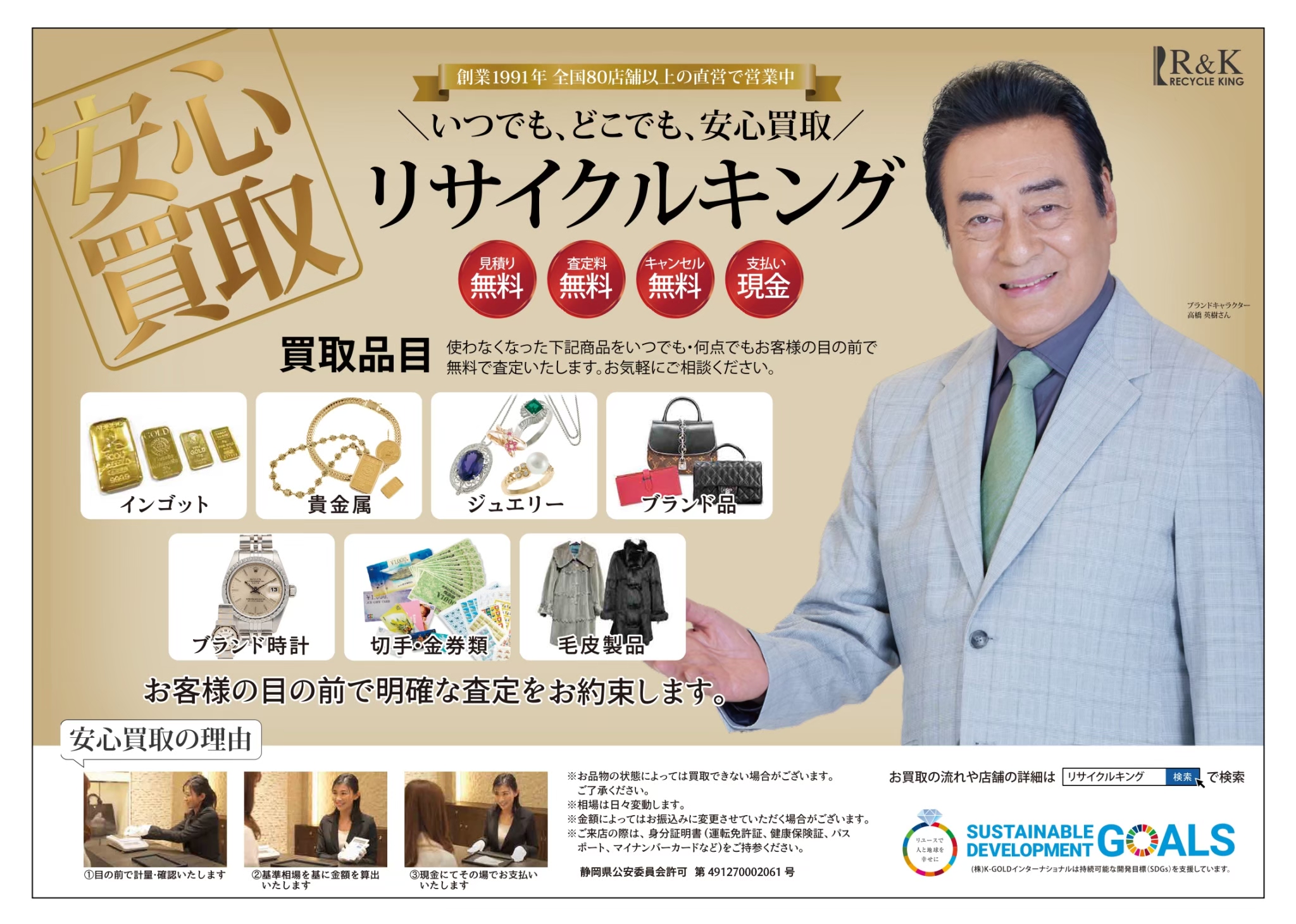 に対する徹底的な追及リサイクルキングは、全世界に90店舗以上のリユース販売店舗を直営・百貨店内常設として運営しております。また世界有数の貿易拠点である香港でもリユース販売店舗を6店舗(今後拡大中)直営展開しております。もちろん世界にお品物をお届けできるEC販売も積極的に行っております。さらに日本・香港で開催される国際宝飾展にも出展し世界の需要を追求し続けております。それにより日本のみならず世界各地のジュエリーデザインやトレンド、またその変化をキャッチしながら、常に世界の需要に沿った付加価値の高い査定を実現しています。